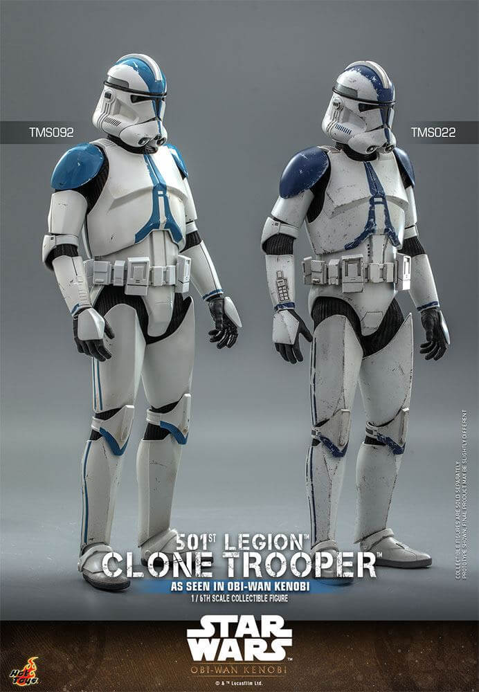 This collectible figure is equipped with newly developed Clone Trooper helmet and armor in 501st Legion's white and blue color design, a specialized under-suit, a heavy blaster, a blaster pistol, a thermal detonator, and a display base.