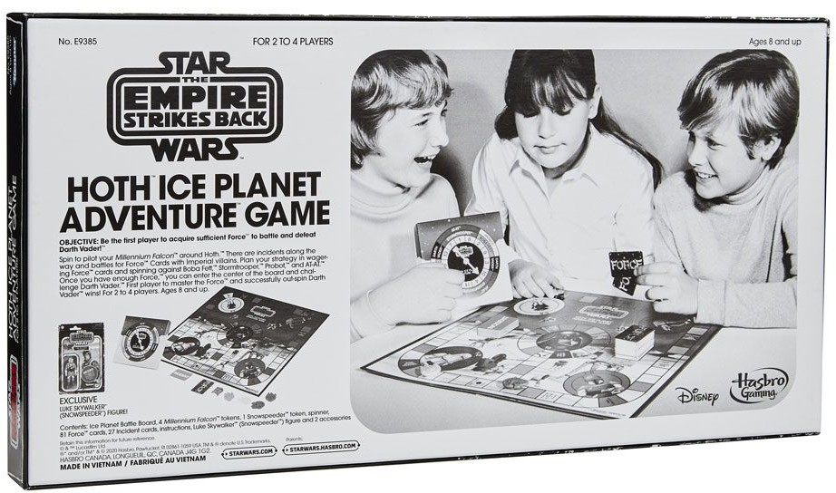 Bring back memories with this retro edition of the Hoth Ice Planet Adventure board game. The game is based on the original board game from Kenner released in 1980 and features artwork inspired by events from the second Star Wars movie, The Empire Strikes Back. This edition of the board game includes an exclusive Luke Skywalker (Snowspeeder) figure. Fans can re-live moments from The Star Wars universe as they imagine traveling around the dangerous Ice Planet Hoth and become a Jedi Knight. Using wits and the Force, players are challenged to battle the four fearsome Enemies they find along the way throughout their adventures on Ice Planet Hoth. Who can defeat the most evil villain the Empire can send against you? Gather the Force to fight and defeat Darth Vader for the win!