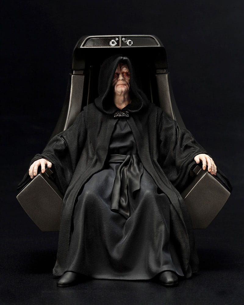 Kejseren af Det Galaktiske Imperium vender tilbage! Kejser Palpatine, også kendt som Darth Sidious, der skabte ravage som den største skurk, dukker op igen i Kotobukiyas Star Wars ARTFX+-serie. Rynkerne i hans ansigt under den kulsorte kappe, de ildevarslende glødende øjne, der er typiske for Sith, og tronen, som han sidder på i en værdig positur, er alle genskabt i mindste detalje i skala 1:10.