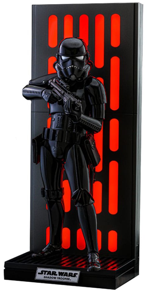 Sideshow og Hot Toys er glade for at kunne præsentere Shadow Trooper Sixth Scale Collectible Figure, som kommer med gode led, professionelt påførte farver, en stofunderdragt og en blasterriffel sammen med en LED-belyset Dødsstjerne-vægpanel-miljøbaggrund i et Star Wars-samlesæt til Star Wars-fans!