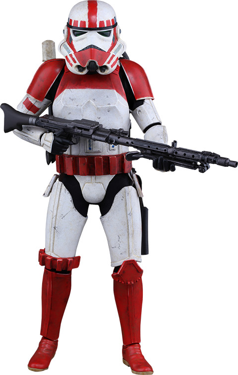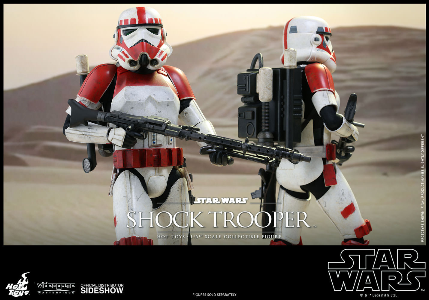 The highly-accurate collectible figure is specially crafted based on the image of the Shock Trooper in Star Wars Battlefront, featuring meticulously crafted armor and helmet, a distinctive red and white color scheme on the armor with weathering effects, detailed weapons and backpack, and a desert-themed figure stand!