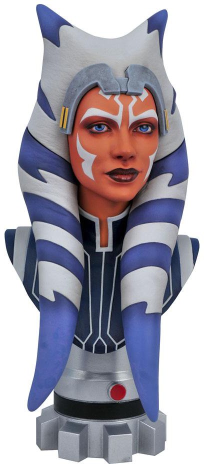 She's made the leap from animation to live-action, and now Ahsoka Tano is a Legend in 3D! This approximately 10" bust captures the Jedi Knight in 1/2 scale, atop a sculpted, lightsaber-inspired pedestal. Limited to only 1,000 pieces, she features detailed sculpting and paint applications, and comes packaged in a numbered, full-color box with a certificate of authenticity.