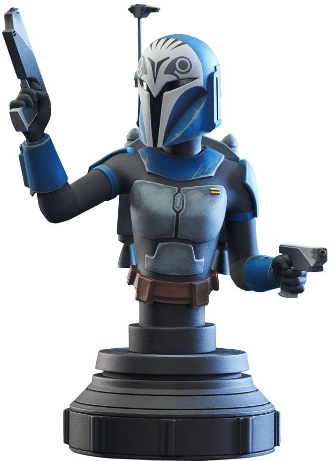 The Mandalorian leader is captured in her animated look in this all-new 1/7 scale resin bust. Depicting Bo-Katan Kryze with her dual pistols in hand this bust also comes with both helmeted & unhelmeted heads for two dynamic display options. Measuring approximately 6" tall, this bust is limited to 3000 pieces and comes packaged in a full-color window box. Designed by Barry Bradfield, sculpted by Paul Harding.