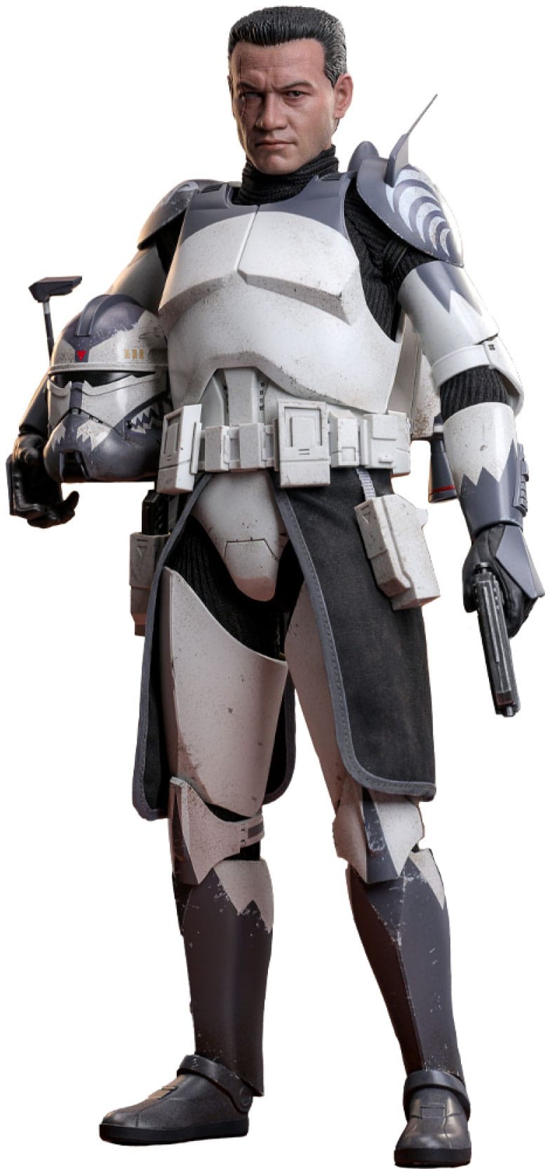 The highly-accurate Clone Commander Wolffe collectible figure features characters' unique armor and helmet with weathering effects and distinctive markings, a head sculpt with realistic likeness, interchangeable helmets and gauntlet accessories to recreate Phase I and Phase II armor appearance, a blaster rifle, a pair of blaster pistols, a jetpack, a data pad and a display base!