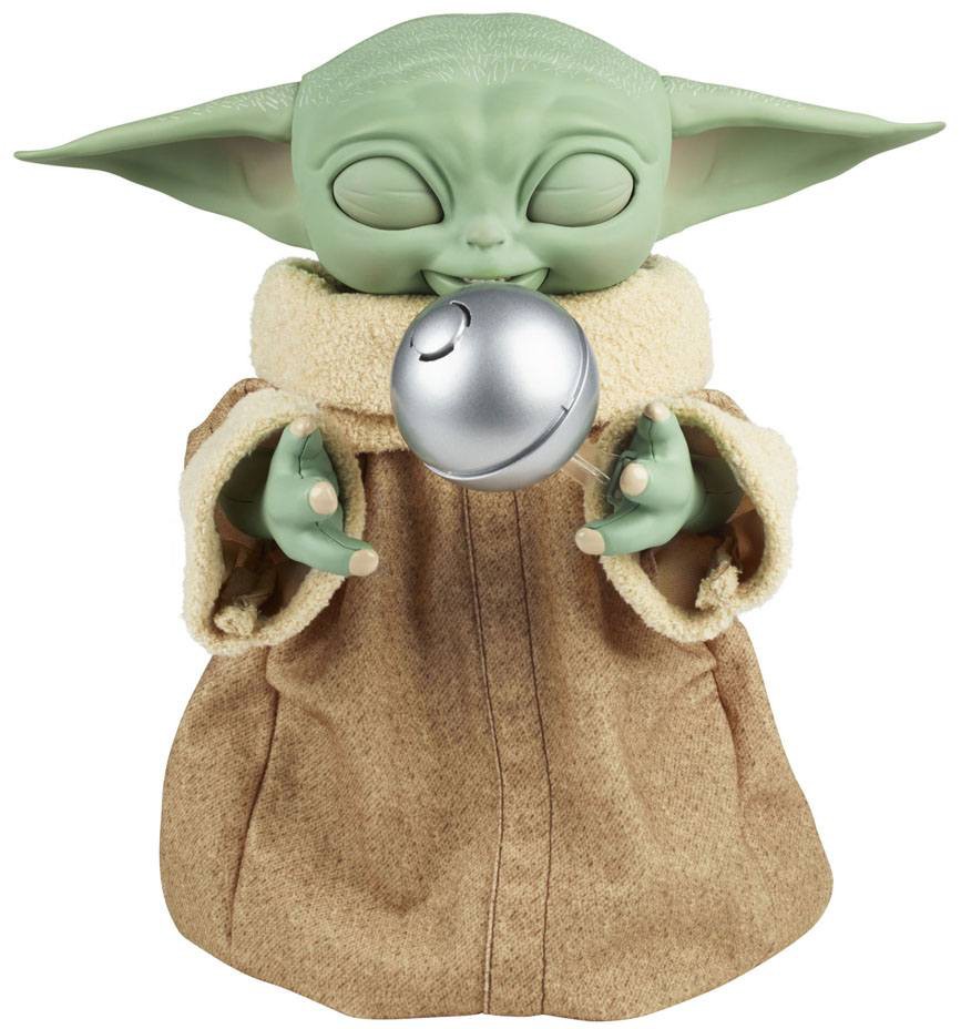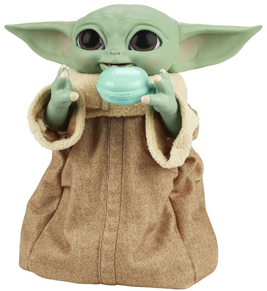 Grogu (The Child), affectionately referred to by fans as "Baby Yoda," is hungry for Force snackin' fun! With a galaxy of features, including adorable sounds, fun animated motions, and interactive accessories, this animatronic toy is ready for action and adventure! Place any of the included entertainment-inspired accessories in his hand and he'll react! Put an accessory in his mouth, and he'll make eating sounds that let you know if he thinks it's yummy or yucky! When Grogu (The Child) wants to be picked up and held, he'll reach up with both arms. And with Force activation, the Galactic Snackin' Grogu toy will perform a 2-handed Force move, inspired by scenes from season 2 of the live-action series The Mandalorian on Disney+! Additional features include series-inspired sound effects, a premium soft goods robe, moving head, ears, arms, and blinking eyes!