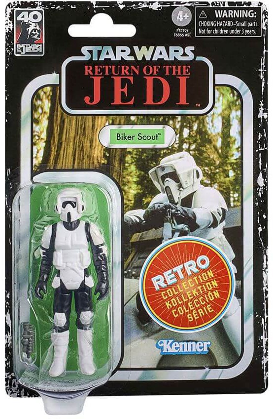 The 3.75-inch-scale Retro Collection figure is detailed to look like a Biker Scout from Star Wars: Return of the Jedi, featuring design and detailing inspired by 1970s Star Wars figures.