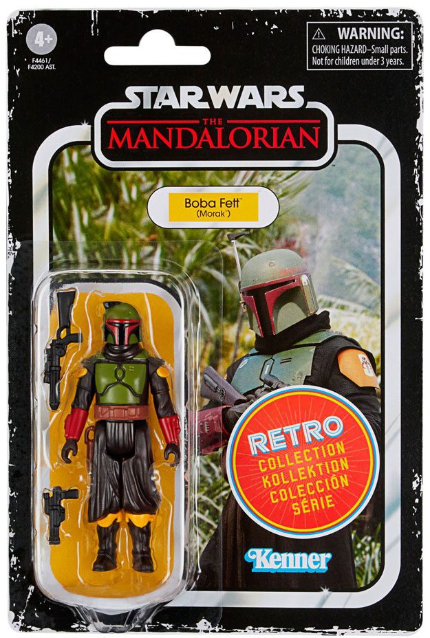 The 3.75-inch-scale Retro Collection figure is detailed to look like Boba Fett (Morak) from Star Wars: The Mandalorian live-action series on Disney Plus, featuring design and detailing inspired by 1970s Star Wars figures.
