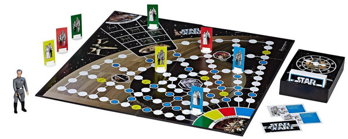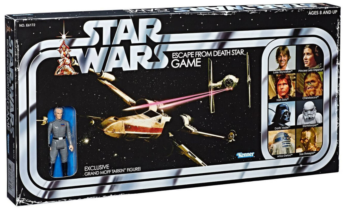 The game is based on the original board game from Kenner released in 1977 and includes an exclusive Retro Collection 3 3/4-inch Grand Moff Tarkin action figure on a retro-style action figure cardback inside the game box.