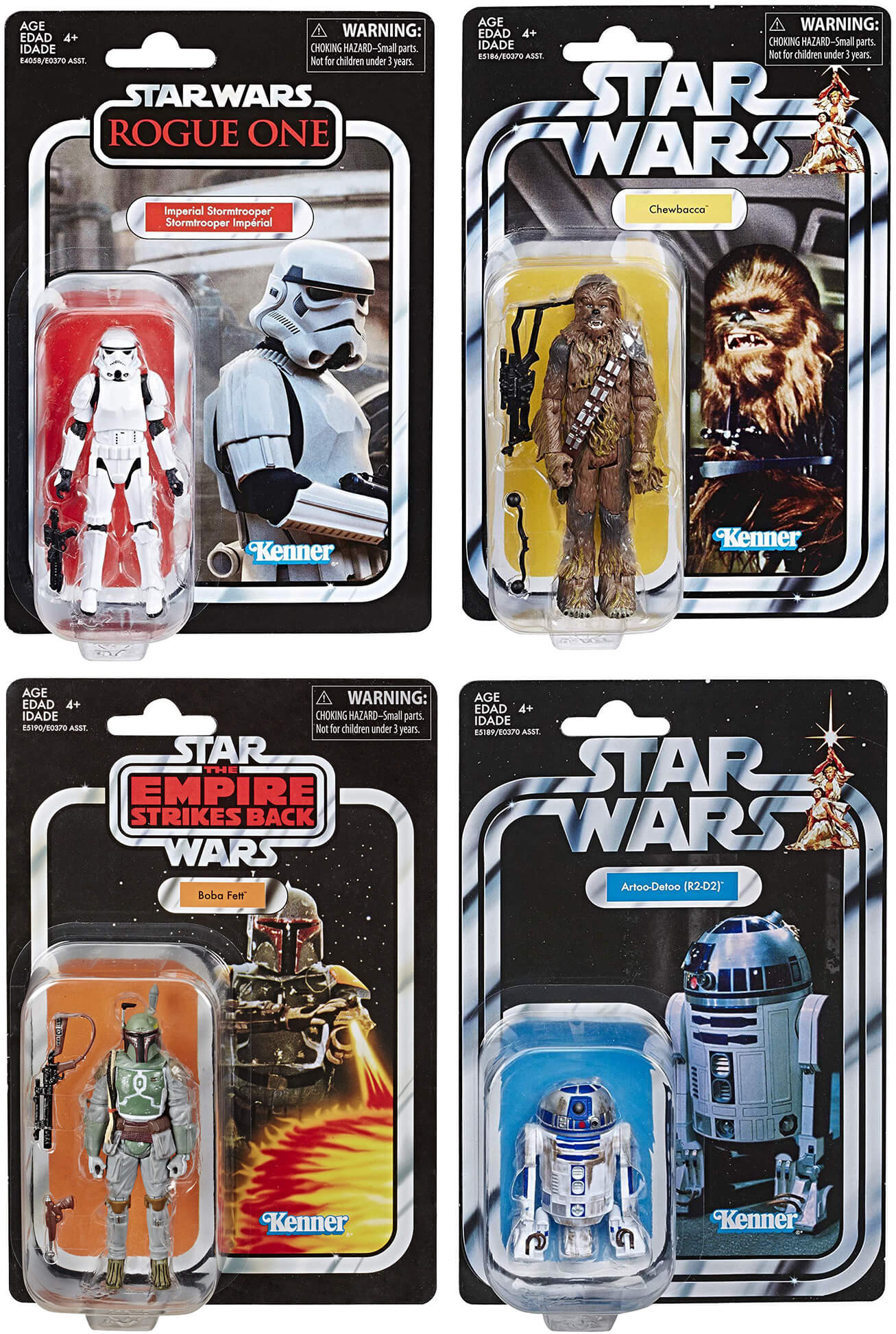 Vintage Star Wars action figures! These 3 3/4-inch scale Star Wars action figures feature classic characters and retro packaging! Longtime fans of Star Wars are going to love this classic Kenner-style packaging, right down to the old-fashioned Kenner logo. And each Vintage Action Figure comes individually packaged with awesome accessories like blasters, lightsabers, and removable helmets. Don't miss this awesome assortment of Star Wars heroes, villains, scoundrels, and robots.