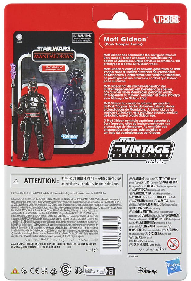 Celebrate the legacy of Star Wars with premium vehicles, playsets, and action figures from Star Wars The Vintage Collection. (Additional products each sold separately. Subject to availability.) Based on Moff Gideon (Dark Trooper Armor) from Star Wars: The Mandalorian, this 3.75-inch-scale figure makes a great addition to any fan's collection. Inspired by the original line, these collectibles feature premium detail and design across product and packaging, as well as collector-grade deco that fans have come to know and love. May the Force be with you!