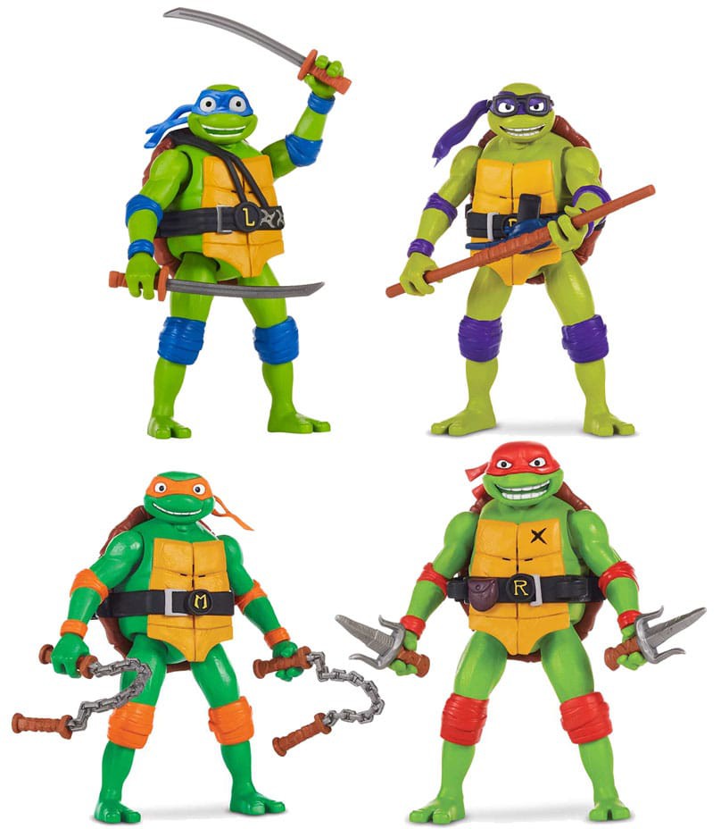 Cowabunga - Teenage Mutant Ninja Turtles er tilbage! 4 lige stærke teenagehelte med uovertrufne evner i kampen mellem det gode og det onde! Sættet består af fire 15 cm høje Shouts Deluxe-actionfigurer inklusive våben i filmisk design. Hver figur har en stemme og lydeffekter.