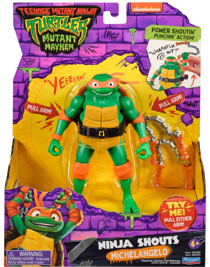 Cowabunga-The Teenage Mutant Ninja Turtles are back! 4 equally strong teenage heroes with unrivalled abilities in the battle of good versus evil! Set consists of one approx. 15cm tall Shouts Deluxe action figure, including weapon in film-accurate design. Each figure has voice and sound effects.