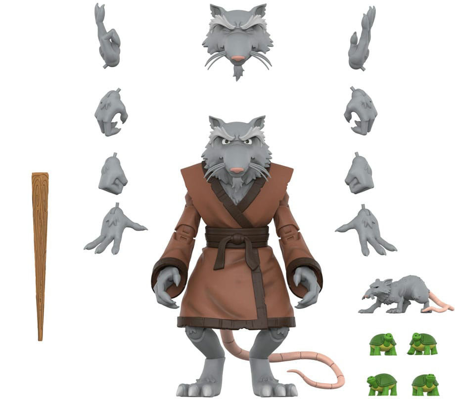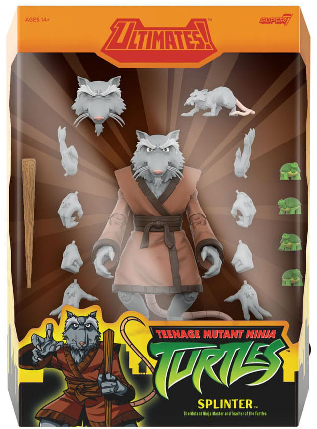 It takes lifelong dedication and discipline to perfect your fighting skills-and to wrangle four teenage boys. Master Splinter, the TMNT's ninja rat dad, has mastered it all... except modern technology. While he can't seem to answer a Shell Cell, he's answering the call to be part of Super7's latest wave of TMNT ULTIMATES! figures inspired by the 2003 TMNT animated series. Featuring double-jointed elbows and knees for dynamic poses, intricate sculpting and premium paint detailing, and a variety of interchangeable heads and hands, this Master Splinter figure comes packed with his walking stick, four baby turtles, and a pre-mutation Splinter rat mini-figure. From training his sons in the art of ninjutsu to protecting them from threats like Shredder and the Foot Clan, Splinter is the ultimate mentor-and now, he can guide your collection to greatness too.