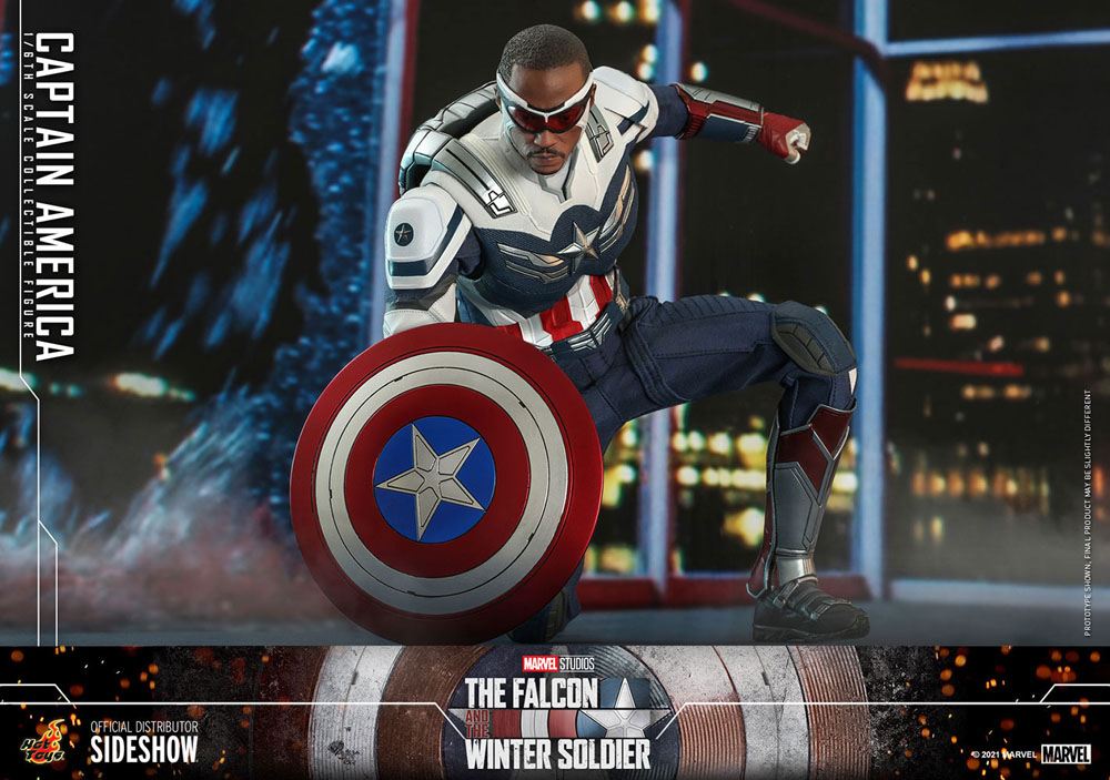 Figuren er mesterligt udformet ud fra Anthony Mackies præstation som den nye Captain America i seriefinalen af The Falcon and the Winter Soldier og har et nyudviklet hoved med ansigtsmaske og beskyttelsesbriller, et nyt taktisk outfit i blå, hvid og rød farve med et stjerneemblem, Captain Americas ikoniske skjold, en flyverygsæk, en Redwing-drone og detaljeret gengivelse af de massive vinger Måler ca. 80 cm i bredden, designet med udvidet artikulation til utrolige actionscener.