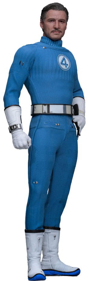 The figure features a newly developed head sculpt with separate rolling eyeballs and sculpted black hair with grey streaks, capturing Pedro Pascal’s likeness. He wears a retro-futuristic Fantastic Four suit with matching belt and boots.