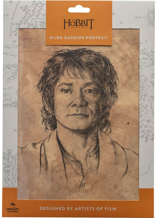 This painstakingly detailed print of Bilbo Baggins (in the likeness of Martin Freeman, who played Bilbo in The Hobbit) comes from the pen of the inimitable artist and calligrapher Daniel Reeve of the 3Foot7 Art Department. Daniel and the crew at 3Foot7 worked on both The Lord of the Rings and The Hobbit trilogies, and their artists and craftspeople are behind many of our beloved collector's items.