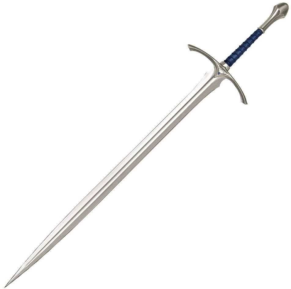 This authentically detailed replica is a reproduction of the actual filming prop built by Weta Workshop of New Zealand and used in the motion picture, THE HOBBIT: AN UNEXPECTED JOURNEY. United Cutlery, industry leader in fine movie reproductions, has meticulously recreated the prop using only the finest grade materials and craftsmanship. Close attention to detail was a top priority. The Glamdring sword is 120.96 cm overall, featuring a stainless steel blade, solid metal hilt parts, faux blue jewel inlays, and a genuine leather-wrapped grip. It is presented with a wood wall display and includes a certificate of authenticity.