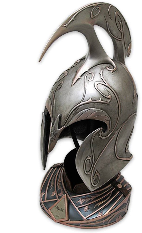 This authentically detailed replica is a reproduction of the actual filming prop used in the motion picture, THE HOBBIT: THE DESOLATION OF SMAUG, built by Weta Workshop of New Zealand. The helm is crafted of reinforced polyresin, with precisely-molded details and coloring, including weathering and aging effects. It is presented with a polystone and wood display, sculpted in the shape of the Rivendell guard neck and shoulder armor. It includes a certificate of authenticity.