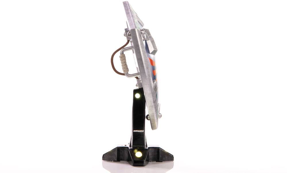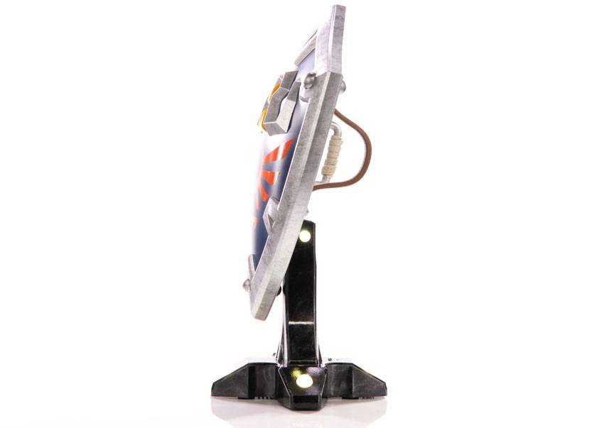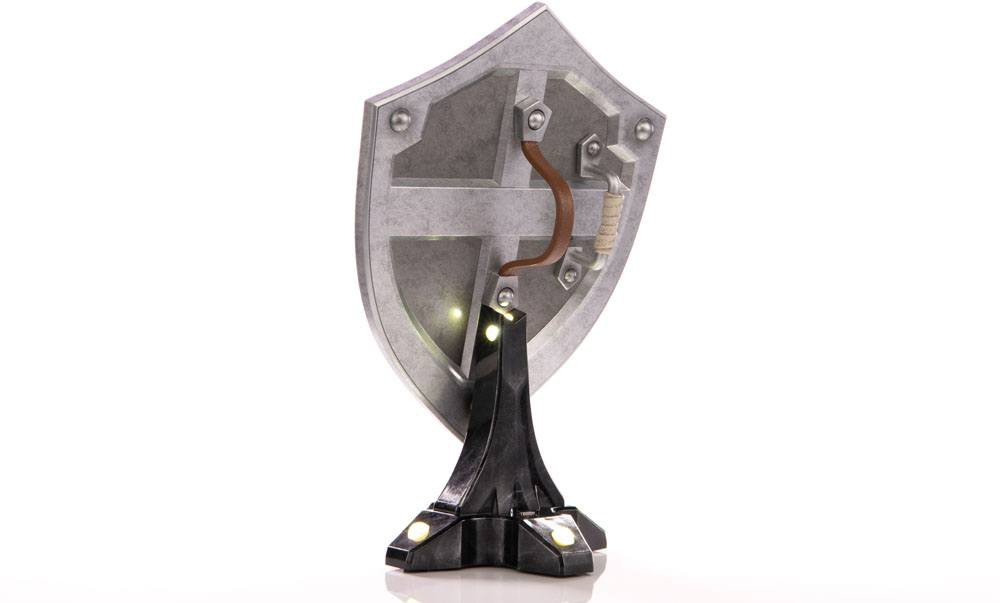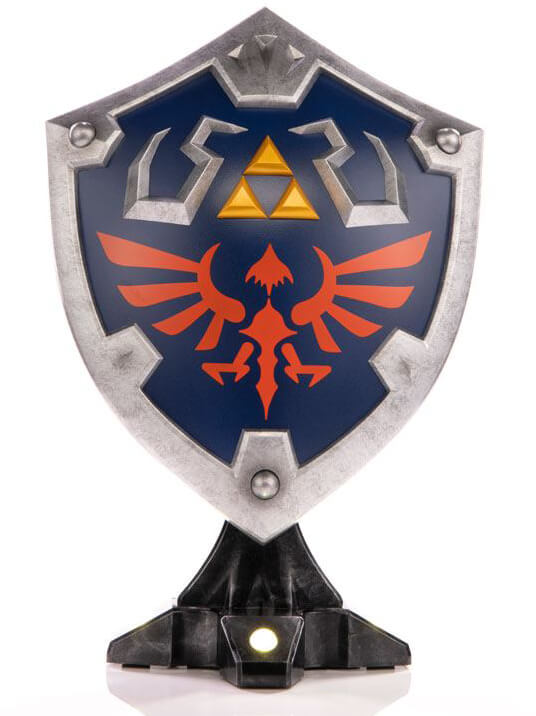 As for the base it's mounted on, the Hylian Shield attaches magnetically to the display stand it comes with, which is simple by design but perfectly accentuates the shield itself. The Collector's Edition of this statue comes with bright LED functionality beneath the gold rivet details of the stand, giving the shield an even more majestic look!