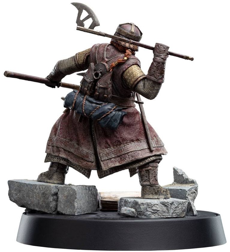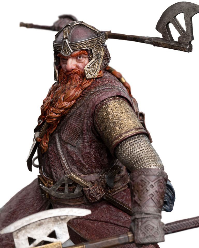 Charging into the thick of battle, Gimli cuts his enemies down to size with an inexhaustible tenacity for which the Dwarven race is known. Learning then, that one of his own kin was slain by an infestation of Orcs, sends the hardened warrior into a rage, transforming the Dwarf into a deadly whirlwind of blade, beard, and fury.