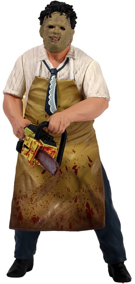 Leatherface er klædt i sit klassiske blodplettede forklæde, skjorte med krave og slips. Den maskerede galning er bevæbnet med sin karakteristiske motorsav, som han kan holde i begge hænder, og er klar til et opgør på slagteriet!