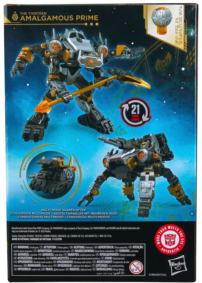Figuren kan også opdeles i flere mindre køretøjer og våben, hvilket giver masser af muligheder for tilpasning. Med høj poserbarhed og tilbehør som cog orb og et le-våben er Amalgamous Prime et markant supplement til enhver Transformers-samling.