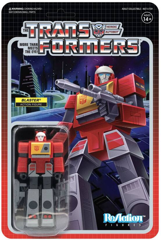 Whether he's thumping phat beats or Decepticon butts, this Autobot is down for high-energy fun! Blaster is such a fan of Earth culture he'd be offended if you didn't consider him for your collection. Portrayed in true G1 style, this 3.75" ReAction Figure will be an invaluable addition to your Transformers lineup.