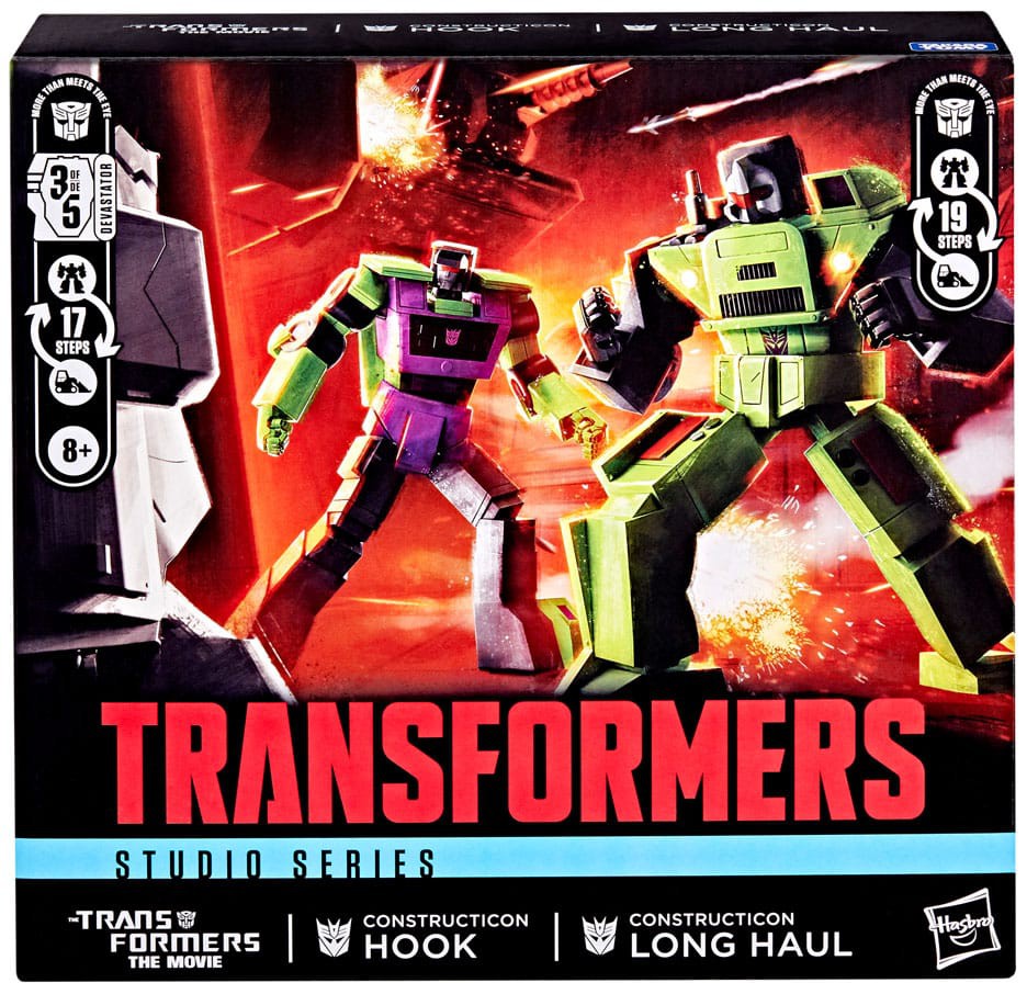 Bring the epic action of The Transformers: The Movie from the screen into your collection with the Transformers Studio Series 6.5-inch (16.5 cm) 2-pack that includes highly articulated Constructicon Long Haul and Constructicon Hook action figures! Convert the Constructicon Long Haul action figure from robot to dump truck mode in 19 steps. Convert the Constructicon Hook action figure from robot to crane mode in 17 steps. Combine with other Transformers Constructicon action figures to create the Devastator action figure!