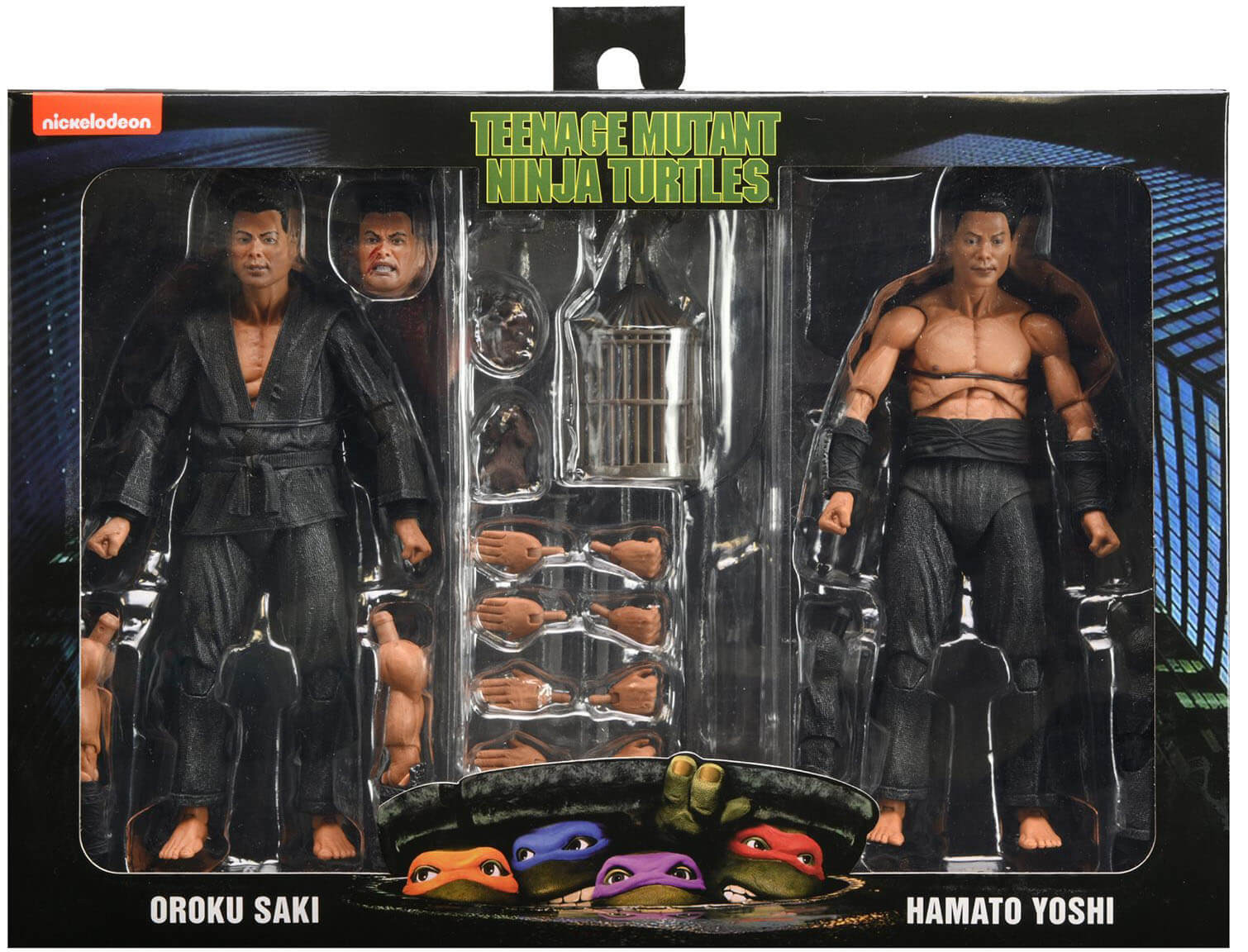 They are raised and trained by Splinter, who was once the devoted pet of Japan's finest Shadow Warrior - Hamato Yoshi. Yoshi's fiercest rival was Oroku Saki, who would eventually become The Shredder. This super-articulated, 7? scale action figure 2-pack includes Yoshi and Saki, plus interchangeable arms, hands and heads, removable shirts, 8 weapons, 2 versions of Splinter and cage with stand. Window box packaging.