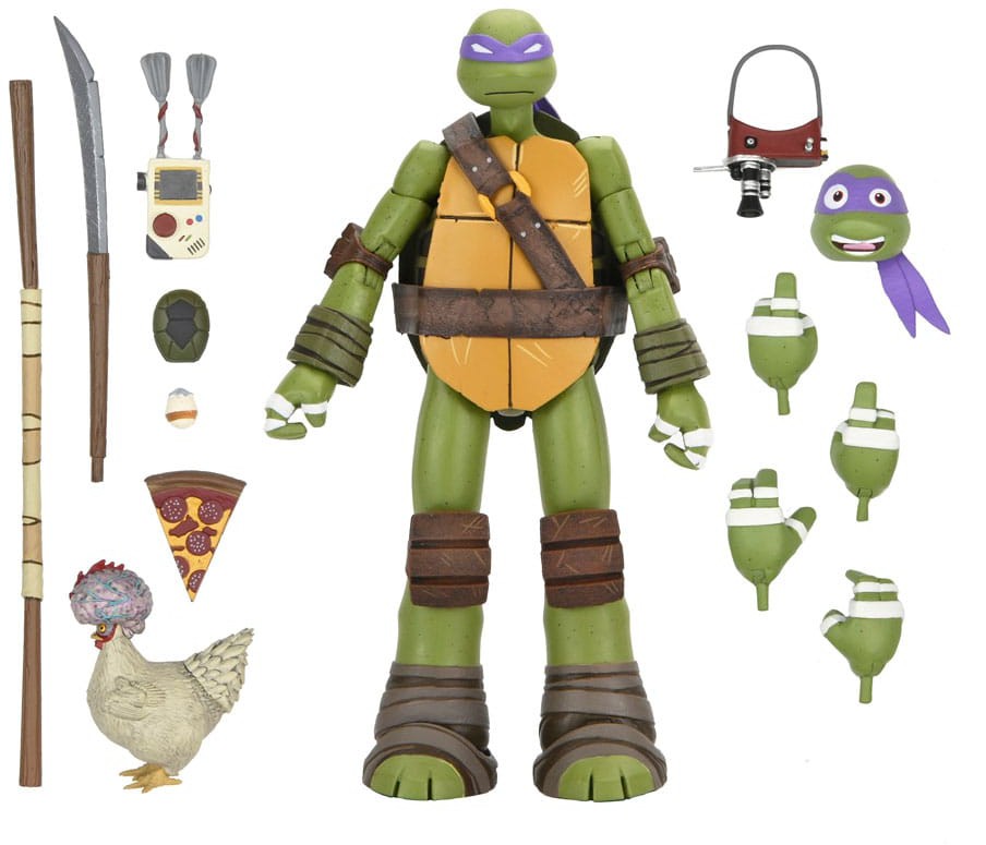 He includes an array of episode-specific accessories: interchangeable heads and hands, bo staff, tracking device, goggles, pizza slice, smoke bomb, Turtlecom, and Dr. Cluckingsworth M.D.