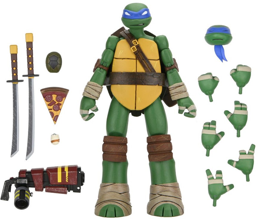 He includes an array of episode-specific accessories: interchangeable heads and hands, katanas, Microfission Omni-Disintegrator, pizza slice, smoke bomb, and Turtlecom.