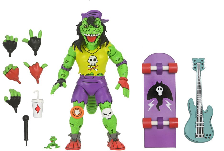 It's the definitive Mondo Gecko for your TMNT collection! This action figure is straight from the pages of Eastman and Laird's Teenage Mutant Ninja Turtles Adventures comic book series from Archie Comics! Mondo Gecko has left the music biz to join the Turtles in their pursuit to do good! This Mighty Mutanimal comes with a load of accessories, including extra hands, skateboard, guitar, pet gecko, soda cup, and microphone! Comes in collector-friendly window box packaging and features all-new illustrations by original TMNT comic book artist Ken Mitchroney.