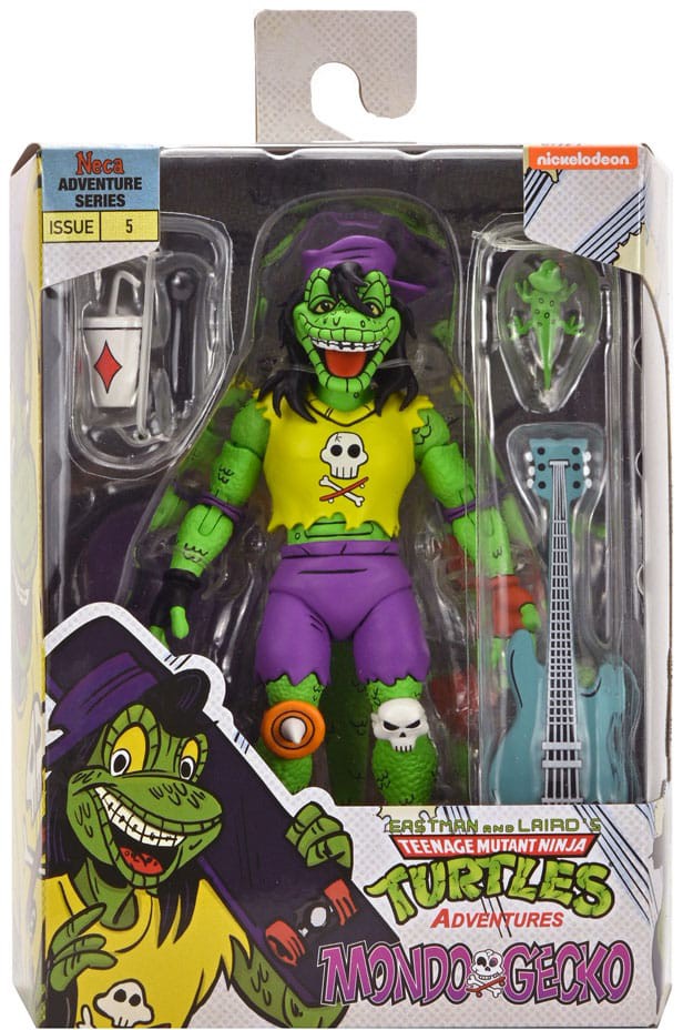 Dette er den endelige Mondo Gecko til din TMNT-samling! Denne actionfigur er taget direkte ud af Eastman og Lairds Teenage Mutant Ninja Turtles Adventures-tegneserie fra Archie Comics! Mondo Gecko har forladt musikbranchen for at slutte sig til Turtles i deres søgen efter at gøre det gode! Dette mægtige mutandyr kommer med en masse tilbehør, bl.a. ekstra hænder, skateboard, guitar, gecko som kæledyr, sodavandsbæger og mikrofon! Leveres i en samlervenlig vinduesæske og har helt nye illustrationer af den oprindelige TMNT-tegner Ken Mitchroney.