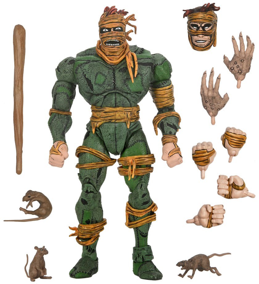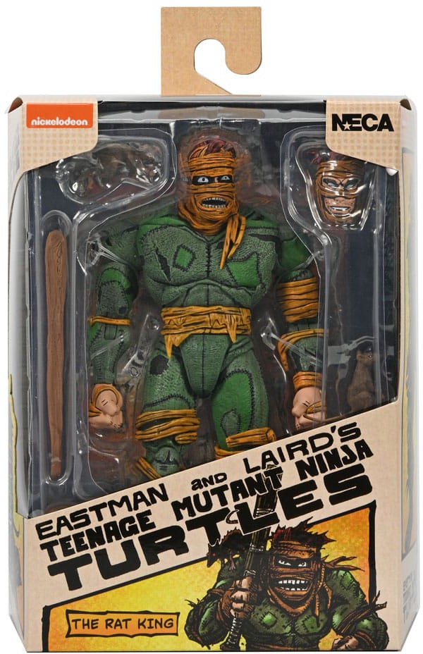 Enter the Rat King! Based on the classic Teenage Mutant Ninja Turtles comic books from Mirage by Kevin Eastman and Peter Laird, this iconic antagonist is ready to join your NECA action figure collection! Standing in 7-inch scale, this rodent overlord includes two different heads to capture different looks, removable leg wraps, regular hands, monster hands, pet rat accessories, and a stick! Comes in collector-friendly packaging with original box art by Eastman.
