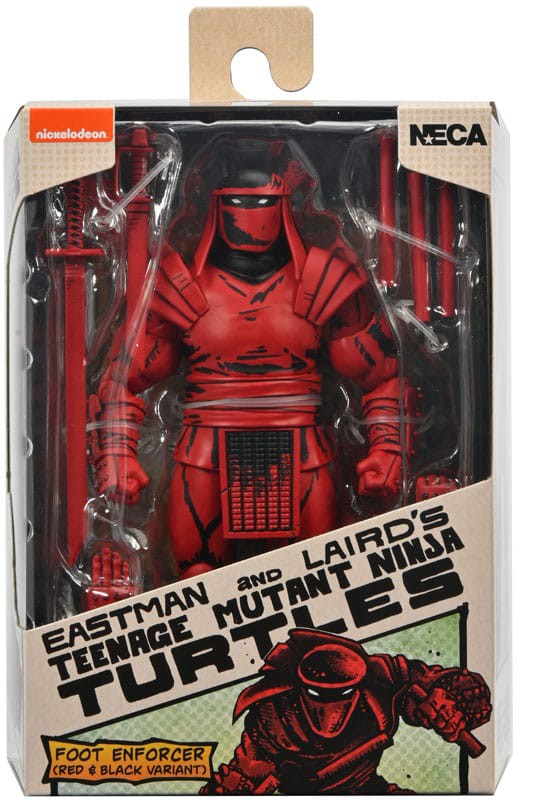 Denne Foot Enforcer-actionfigur har et spændende nyt rødt og sort farveskema. Den omfatter en tredelt stav, ninjato, sommerfuglesværd, naginata og fire sæt udskiftelige hænder. Dette NECA-samleobjekt leveres i en særlig vinduesæske med tegneserietema illustreret af Kevin Eastman.