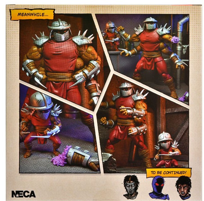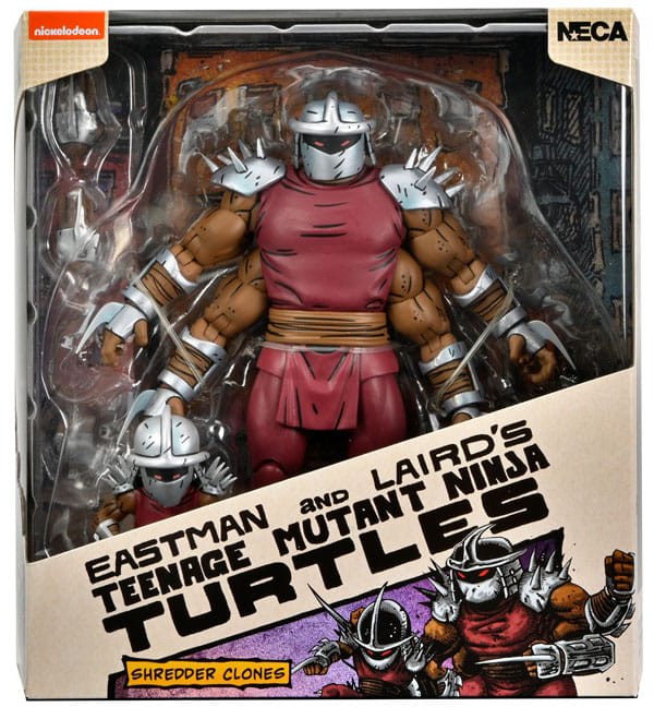 Based on the original Eastman & Laird Teenage Mutant Ninja Turtles comic books from Mirage Studios! Shredder is back... sort of? The Foot have conducted cloning experiments to bring their leader back from the grave. As they work out the bugs, or more specifically, the Space Worms, to perfect the cloning process, the Turtles must battle these twisted monstrosities. These 7" scale figures (4-Arm Shredder is approximately 7" tall and Mini Shredder is 2.8" tall) include extra hands, and space worm attachments to create battle damaged forearm! Comes in special comic-book themed window box packaging with new illustration by Kevin Eastman!