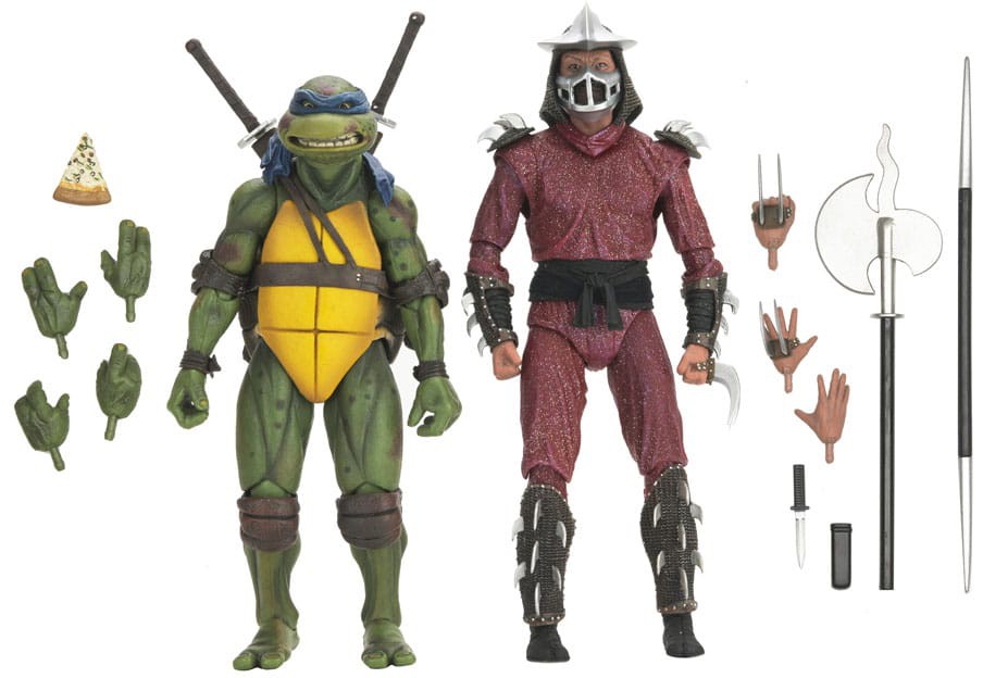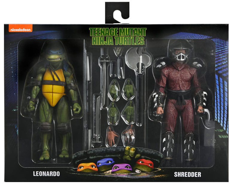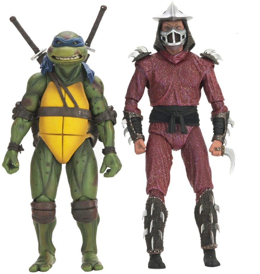 Calling all Teenage Mutant Ninja Turtle movie fans! Recreate the epic rooftop battle from the climax of the 1990 film with this NECA action figure 2-pack! Standing in 7-inch scale, Leonardo and The Shredder are ready to fight it out with a variety of accessories, including interchangeable hands and an arsenal of heroic and villainous ninja weapons! This figure set comes in collector-friendly window box packaging.
