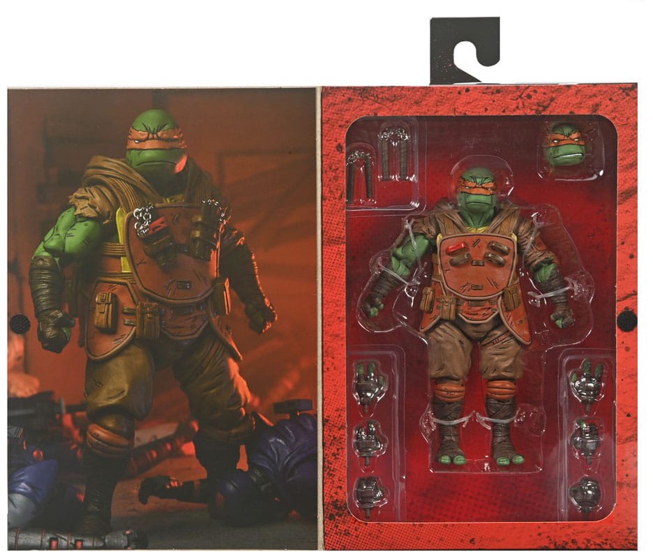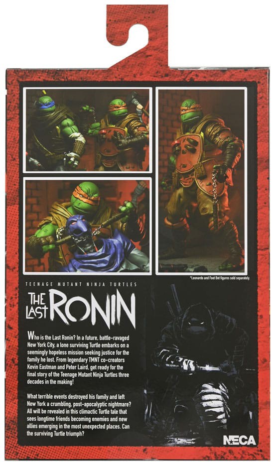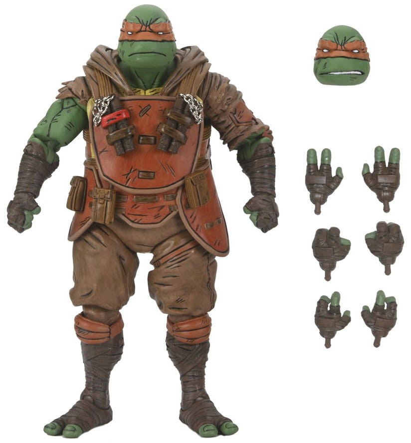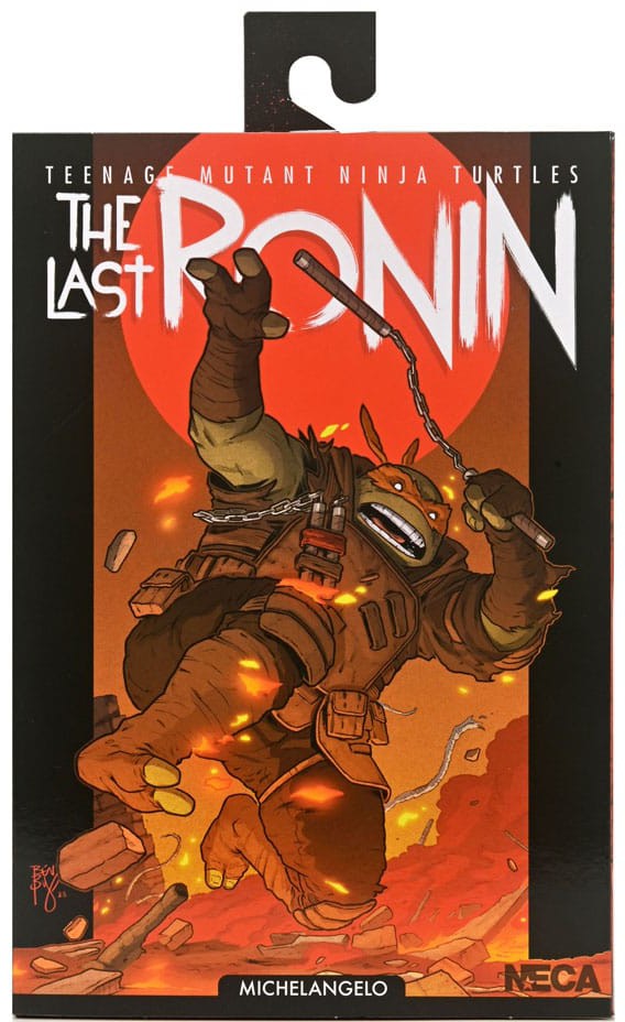 From the Teenage Mutant Ninja Turtles comic book series, The Last Ronin! In a future NYC far different than the one we know today, a lone surviving Turtle goes on a seemingly hopeless mission to obtain justice for his fallen family and friends. Based on issue #3 of the comic, this Michelangelo figure stands in 7-inch scale with over 30 points of articulation and includes extra hands, head, and nunchucks that fit onto his body armor. Comes in collector-friendly window box packaging with opening flap featuring a custom illustration by The Last Ronin artist Ben Bishop.