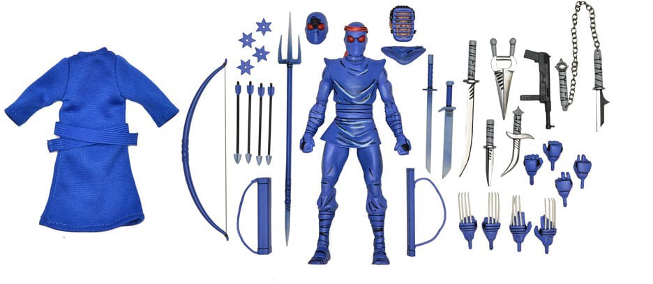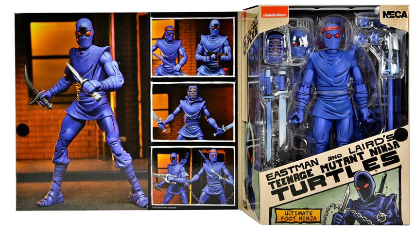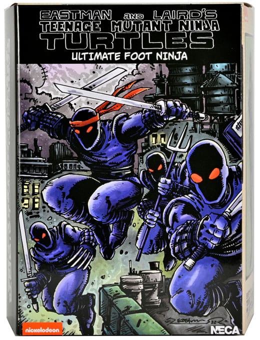 NECA is thrilled to announce its first Ultimate figure from the original Eastman & Laird Teenage Mutant Ninja Turtles comic books from Mirage Studios! The "Ultimate" minion, the faceless Foot Ninja stands ready to do the bidding of the sinister Shredder, leader of his clan. This deadly ninja stands approximately 7" tall, and includes extra heads, extra hands, cloth robe, hood, bow & arrow, quiver, sword & sheath, ninja stars, trident, katar, butterfly sword, katana, knife, kusarigama, and tekko kagi! Comes in collector-friendly 5 panel packaging with opening front flap featuring all new art by Kevin Eastman.