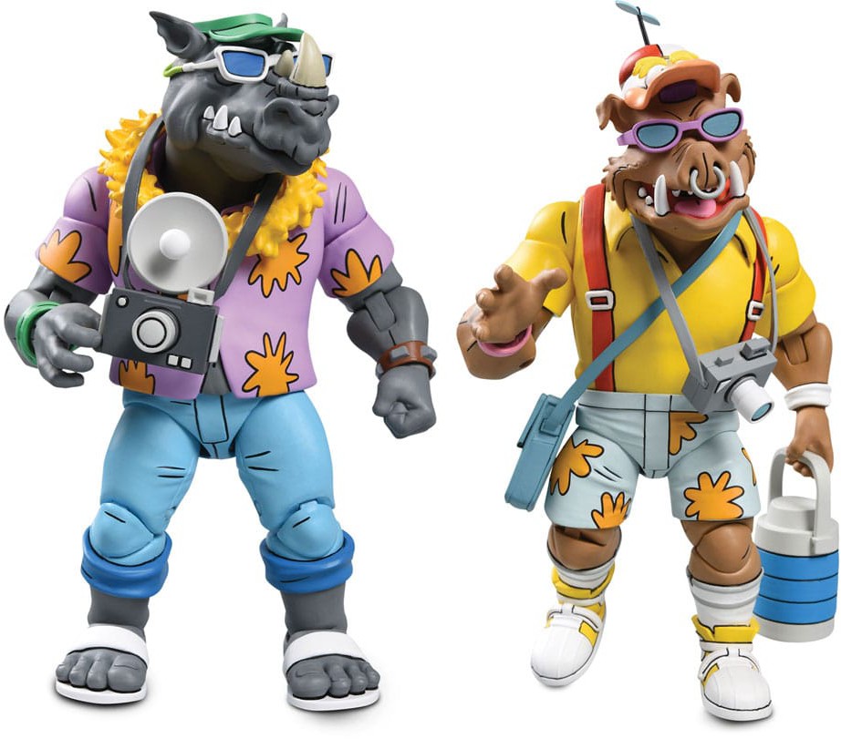 Based on the classic 1980s Teenage Mutant Ninja Turtles cartoon series! Now you can add Vacation Bebop and Rocksteady, as seen in the episode "Napoleon Bonafrog: Colossus of the Swamps," to your TMNT collection! Standing in 7-inch scale, both NECA action figures feature hinged jaws and come with extra hands. Other accessories include a mutant dragonfly buddy, cameras, travel bags, and excitement galore! Comes in collector-friendly window box packaging.