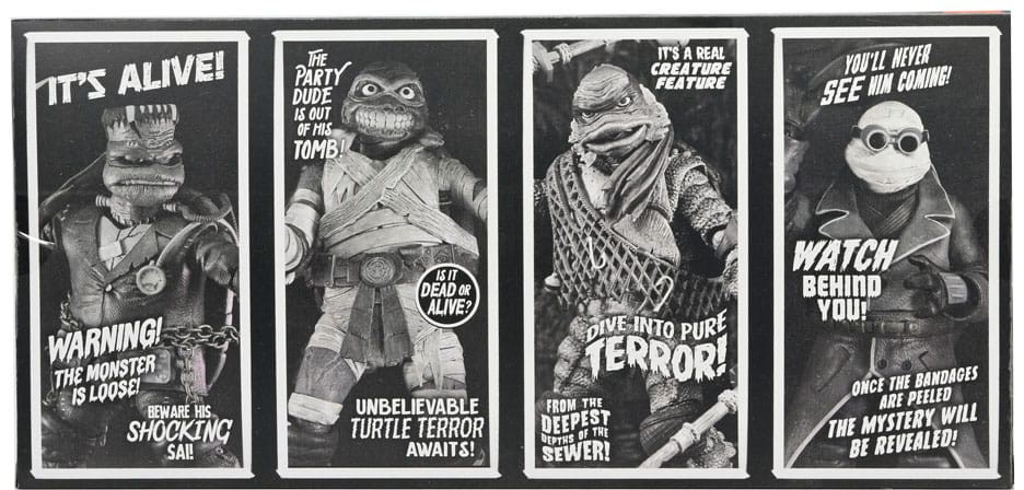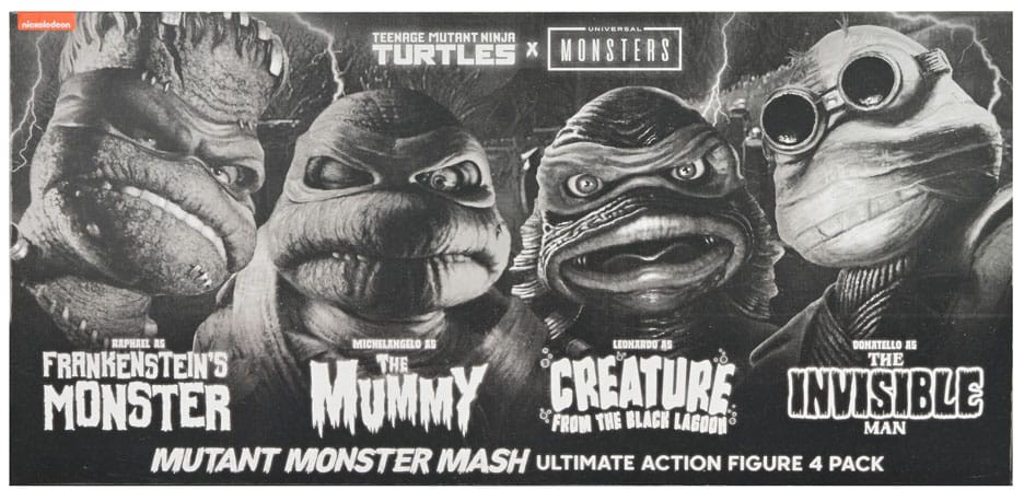 Paying tribute to the world's most famous turtles and Universal's icons of horror, this epic 4-pack reimagines the Heroes in a Half Shell as classic monsters in spine-tingling black-and-white deco.
