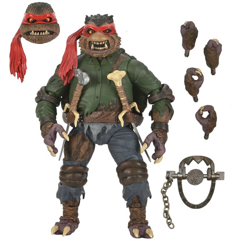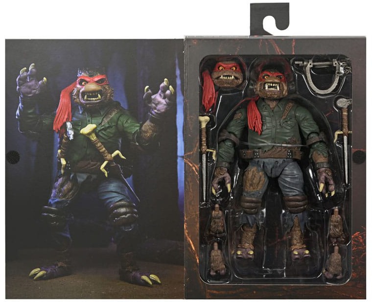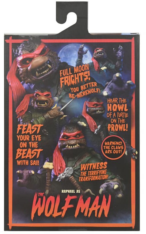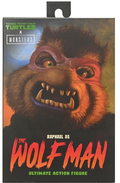The next release in NECA's Universal Monsters x Teenage Mutant Ninja Turtles action figure line is Raphael as the Wolf Man! This continuing line pays tribute to the world's most famous turtles and Universal's icons of horror. This 7" scale action figure reimagines Raphael as the tragically doomed Wolf Man, and he's packed with accessories. This fully articulated figure includes two sais that fit into his belt (one of which is styled after the movie's wolf head cane), two interchangeable heads, swappable hands, and animal trap. Comes in collector-friendly window box packaging with opening flap featuring an all-new illustration by Daniel Horne.