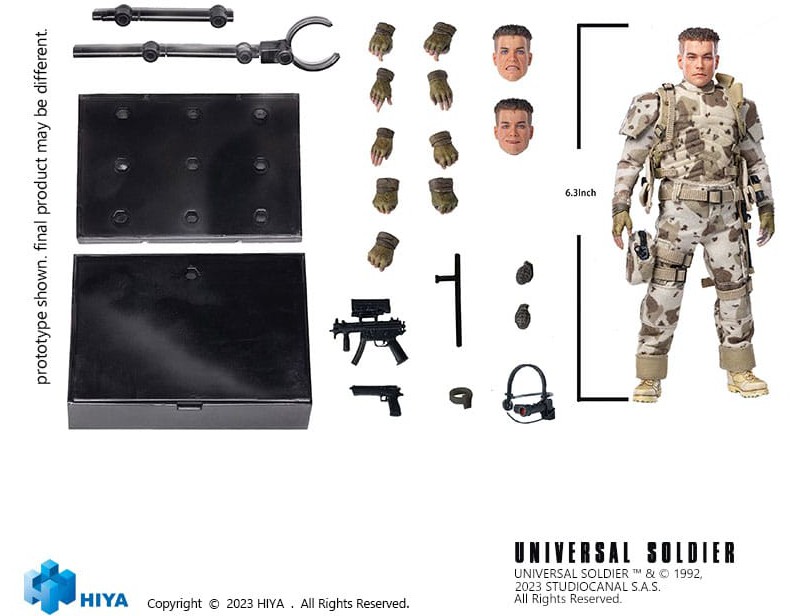 This brand-new Luc action figure stands at 160mm tall and faithfully reproduces his appearance from 'Universal Soldier' (1992). Luke is dressed in a camouflage combat suit with straps for gun holsters and grenade pouches. The combat suit and straps are made from real fabric, ensuring both articulation and aesthetic appeal. Accessories include MP5K SMG (detachable magazine), desert eagle pistol (detachable magazine), 2X grenades, communication headset, police baton, life meter. Additional 7x interchangeable hands and 2x interchangeable head sculpt ensure dynamic combat poses, echoing the film's intense scenes.