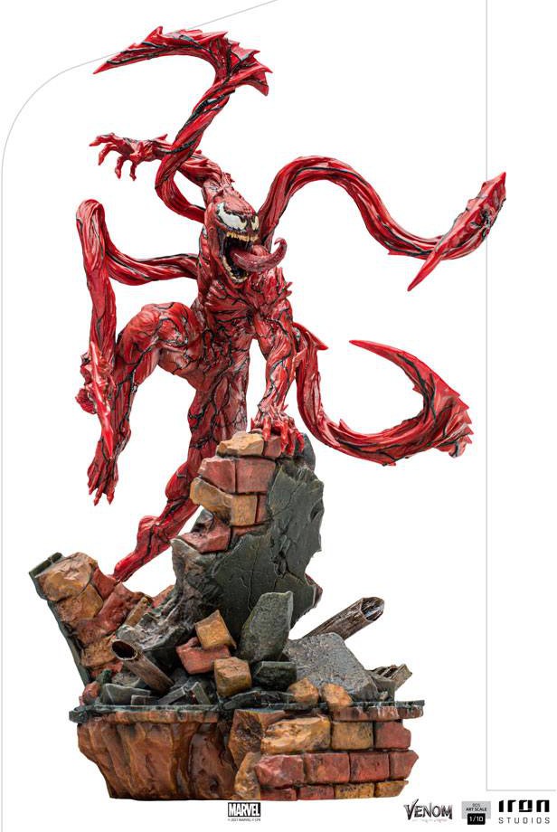 Over the rubble of a building, he appears with several limbs in his scarlet body, limbs that are sharp, cutting, and lethal at their ends. The deadly and insane symbiote creature opens its big mouth, like the predator it is, showing its teeth and its grotesque red-black tongue at its adversary. Derived from its form presented in theaters, Iron Studios brings the statue "Carnage - BDS Art Scale 1/10 - Venom: Let There Be Carnage", one of the most dangerous and lethal villains created in the Marvel universe, which hits the big screen as the antagonist of its creator and rival, the anti-hero Venom.