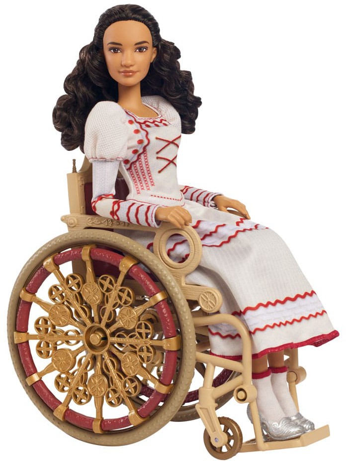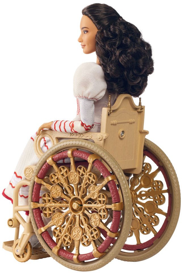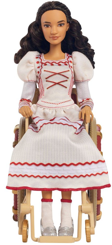 Inspired by Universal Pictures' Wicked, the Nessarose fashion doll captures the heart of sisterhood from the movie! Nessarose doll features her manual, golden wheelchair with ornate details throughout and wears a removable outfit with detailed texture prints and red trim, accessorized with classic, jeweled slippers. With flexibility at the torso, elbows, wrists, and knees, Nessarose has the character's true-to-movie details and her brown, curly hair. Fans will want to collect all the dolls from the land of Oz! Each sold separately, subject to availability. Dolls cannot stand alone.