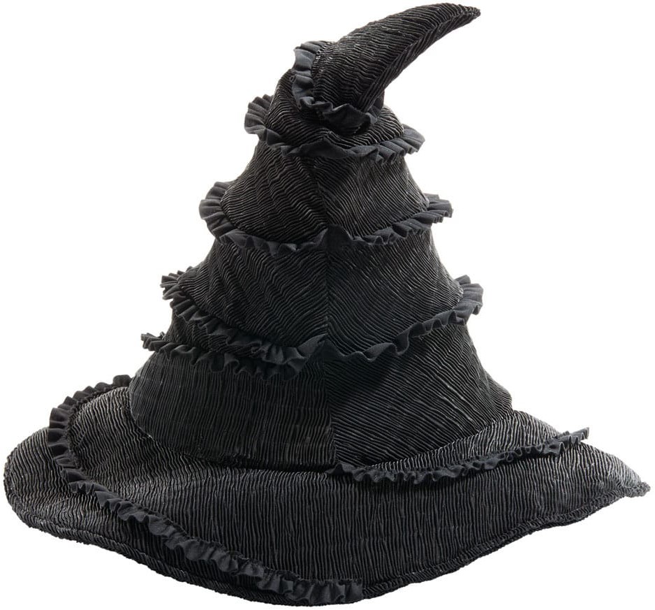 This adult-sized replica hat measures approx. 15" (38 cm) tall with a 14" (36 cm) brim and features intricately textured fabric, collapsible tiers, and ruffles along each pleat in the fabric.