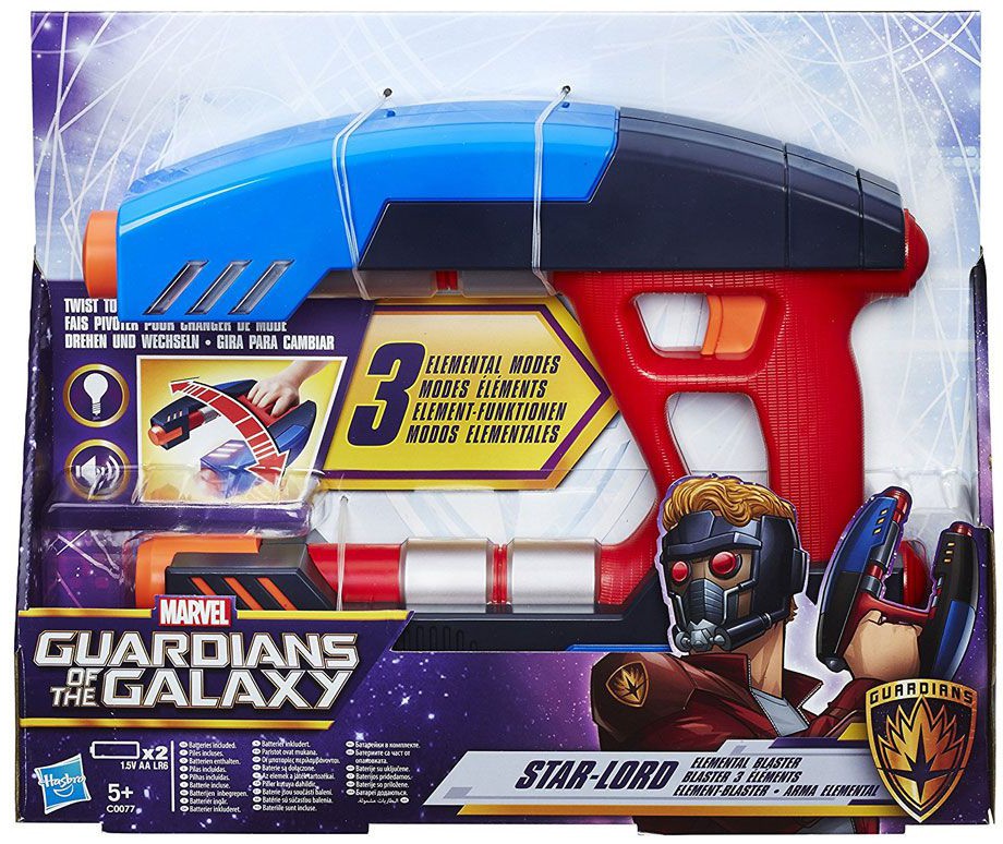 Gear up like Star-Lord with the Star-Lord Elemental blaster! The Star-Lord Elemental Blaster boasts 3 unique blasting settings with different lights and sound effects that just might pack enough galaxy-saving dominance to shut down the bad guys. Rotate the blaster to access new elemental modes, including Water, Fire, and Electricity. Green lights signify water, so kids can imagine dousing their enemies and leaving them in soaked defeat. Red lights signify fire, letting future galactic guardians pretend to burn their opposition to a crisp. Finally, yellow lights signify electricity, so universal protectors can imagine shocking the bad guys with electric force! With the power of elements locked and loaded with the Star-Lord Elemental blaster, intergalactic space-punks don't stand a chance.