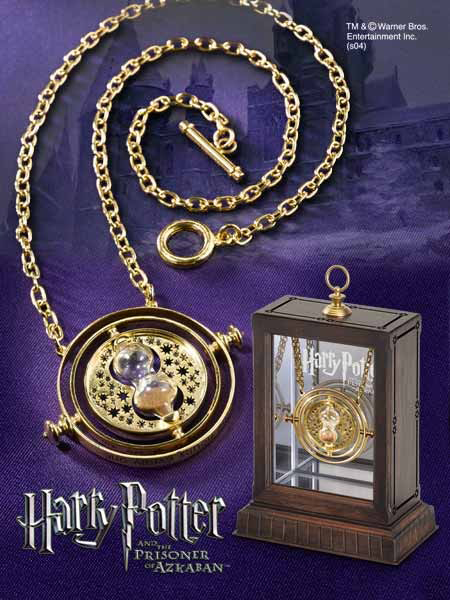 An authentic recreation of Hermione´s Time-Turner featured in the movie Harry Potter and the Prisoner of Azkaban. The Time-Turner is centered with a working miniature hourglass and its inner rings rotate. Plated in 24 karat gold, measures 1 3/8 inches in diameter. Chain measures 18 inches. Comes complete with a display.