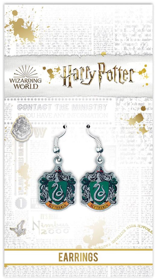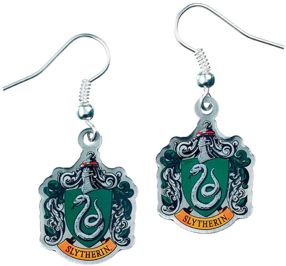 Våbenskjoldet for det berømte hus, der blev grundlagt af Salazar Slytherin. Officielt licenserede Harry Potter-øreringe på forsølvede øreringskroge.