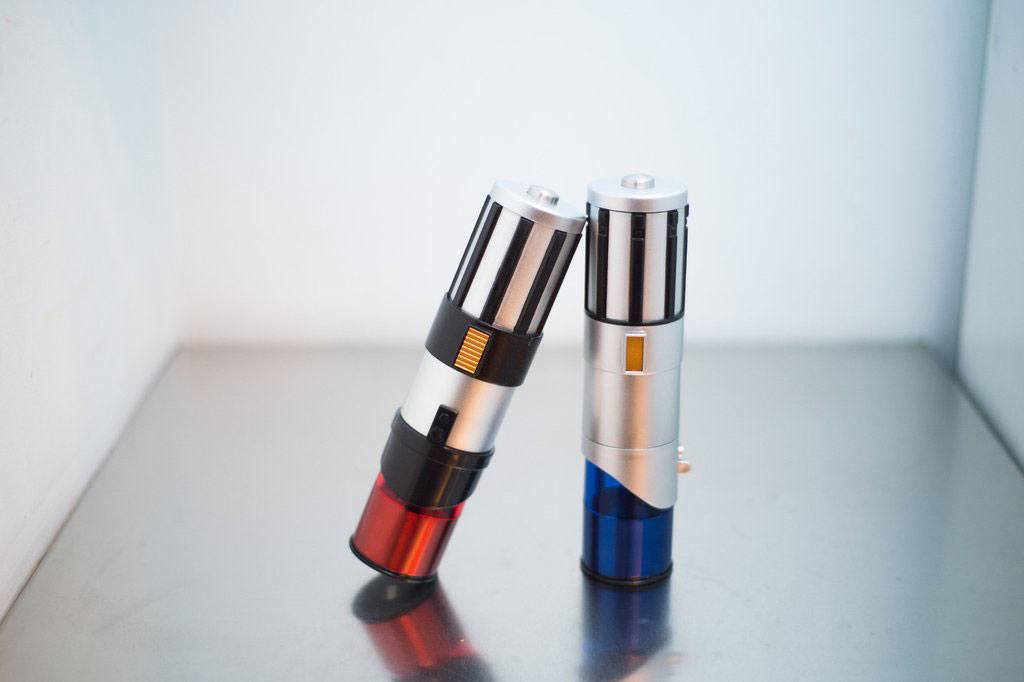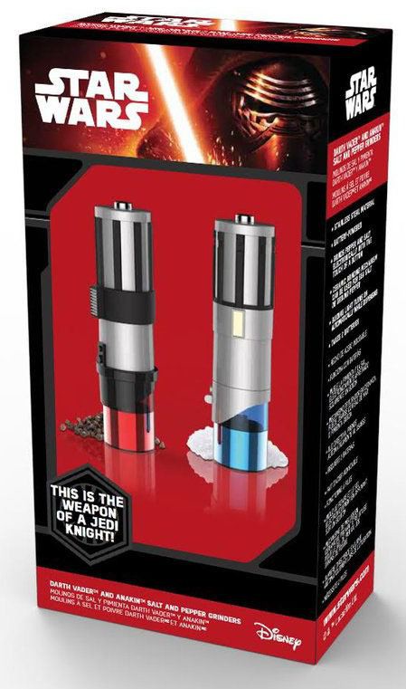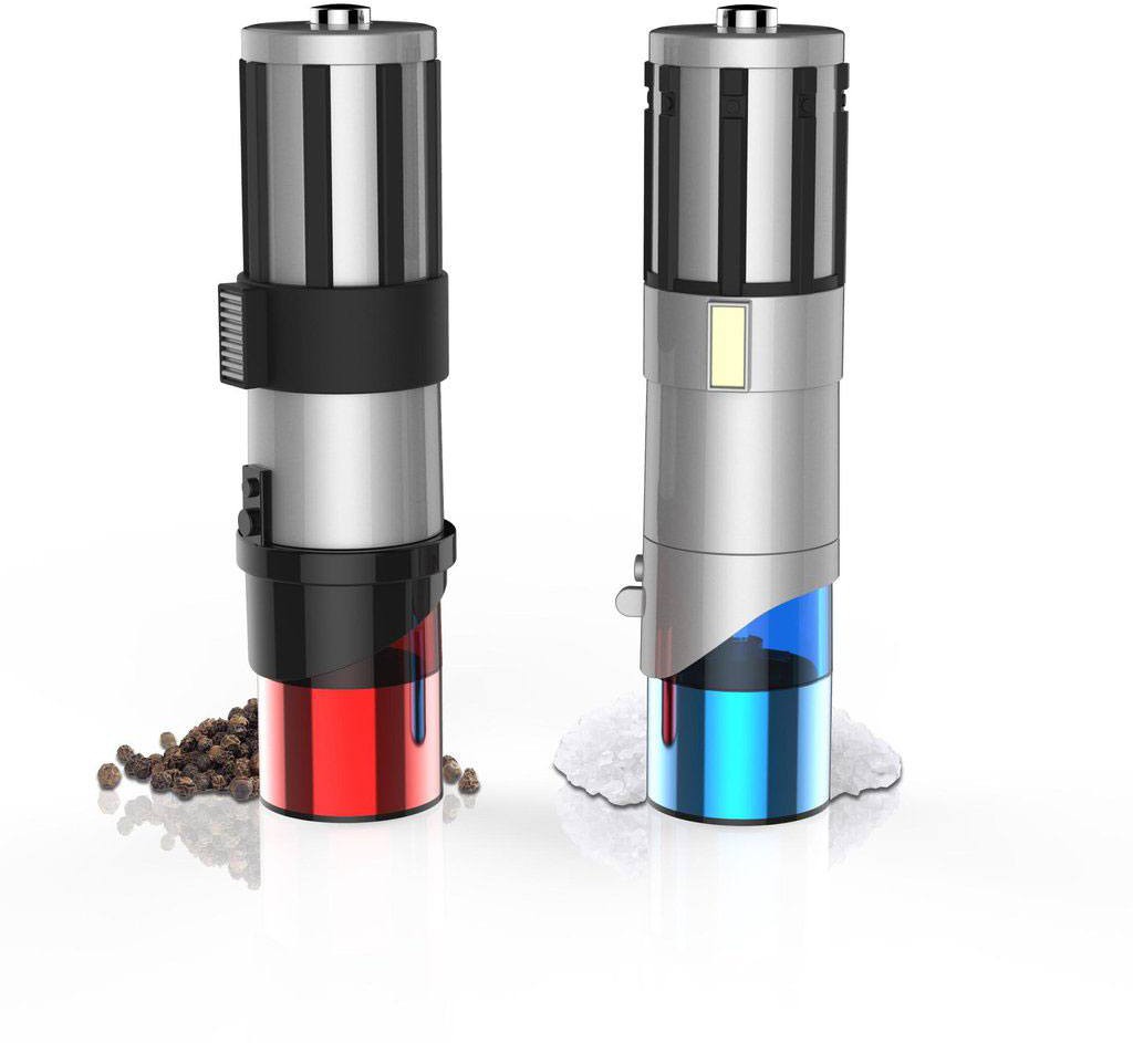 Not as clumsy or random as a regular salt and pepper shaker, these elegant lightsaber grinders have a ceramic mechanism you can adjust from fine to coarse. These mills are made from high-quality stainless steel, and their exteriors are durable ABS plastic molded to look like your favorite Jedi weapon. Each runs on four AA batteries (not included). Set of two grinders - one red and one blue. Not dishwasher safe.